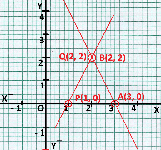 ৰেখা দুটাই x - অক্ষৰ লগত কৰা ত্রিভুজটোৰ শীর্ষবিন্দুকেইটাৰ স্থানাংক হ'ল (-1, 0), (2, 3) আৰু (4, 0)