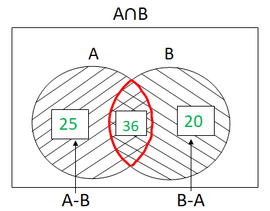 n(A∪B) = 25 + 36 + 20 (ছাঁ দিয়া অংশ)