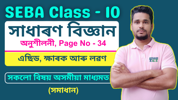 SCERT দশম শ্ৰেণী সাধাৰণ বিজ্ঞানৰ এছিড, ক্ষাৰক আৰু লৱণৰ অনুশীলনী পৃষ্ঠা 34ৰ সমাধান আৰু ব্যাখ্যা। অসমীয়া মাধ্যমত শ্ৰেণী 10ৰ এই অধ্যায়ৰ পৰিসৰে ছাত্র-ছাত্রীসকলৰ বিদ্যা লাভ সহজ কৰি তুলিবলৈ সহায়।